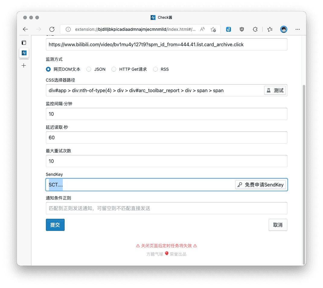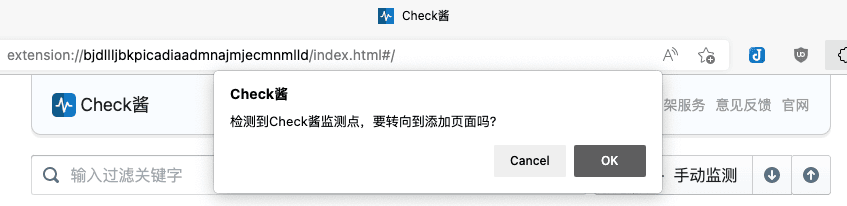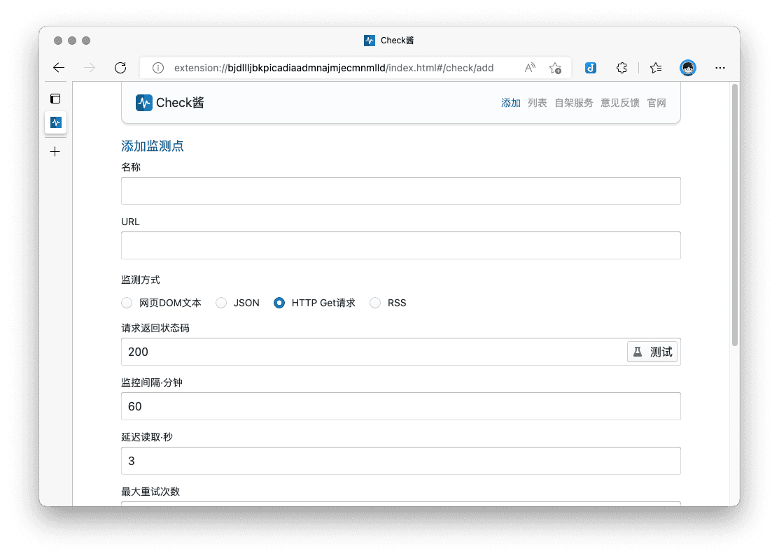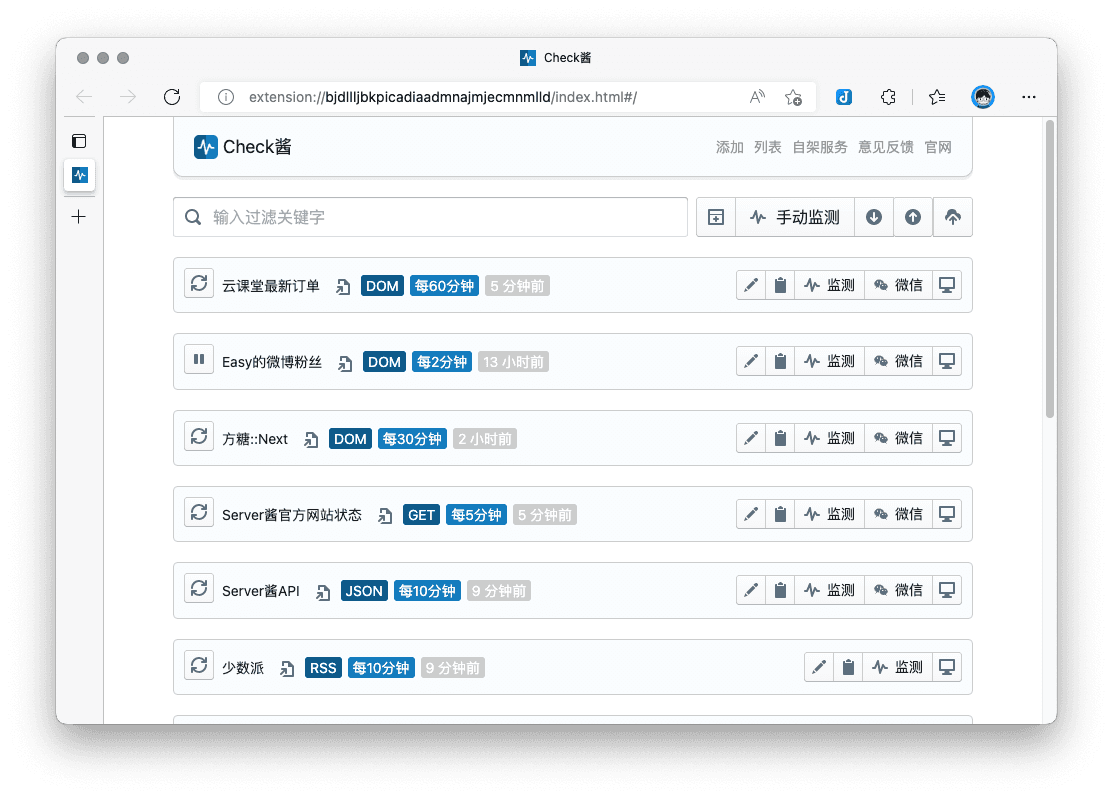 checkchan://title=Server%E9%85%B1%E5%AE%98%E6%96%B9%E7%BD%91%E7%AB%99%E7%8A%B6%E6%80%81&url=https%3A%2F%2Fsct.ftqq.com&type=get&code=200&rss_field=title&delay=3&retry=10After copying the above characters, paste them with Ctrl+V in the CheckChan browser plugin interface, and it will automatically recognize and jump to the āAdd Monitoring Pointā interface.