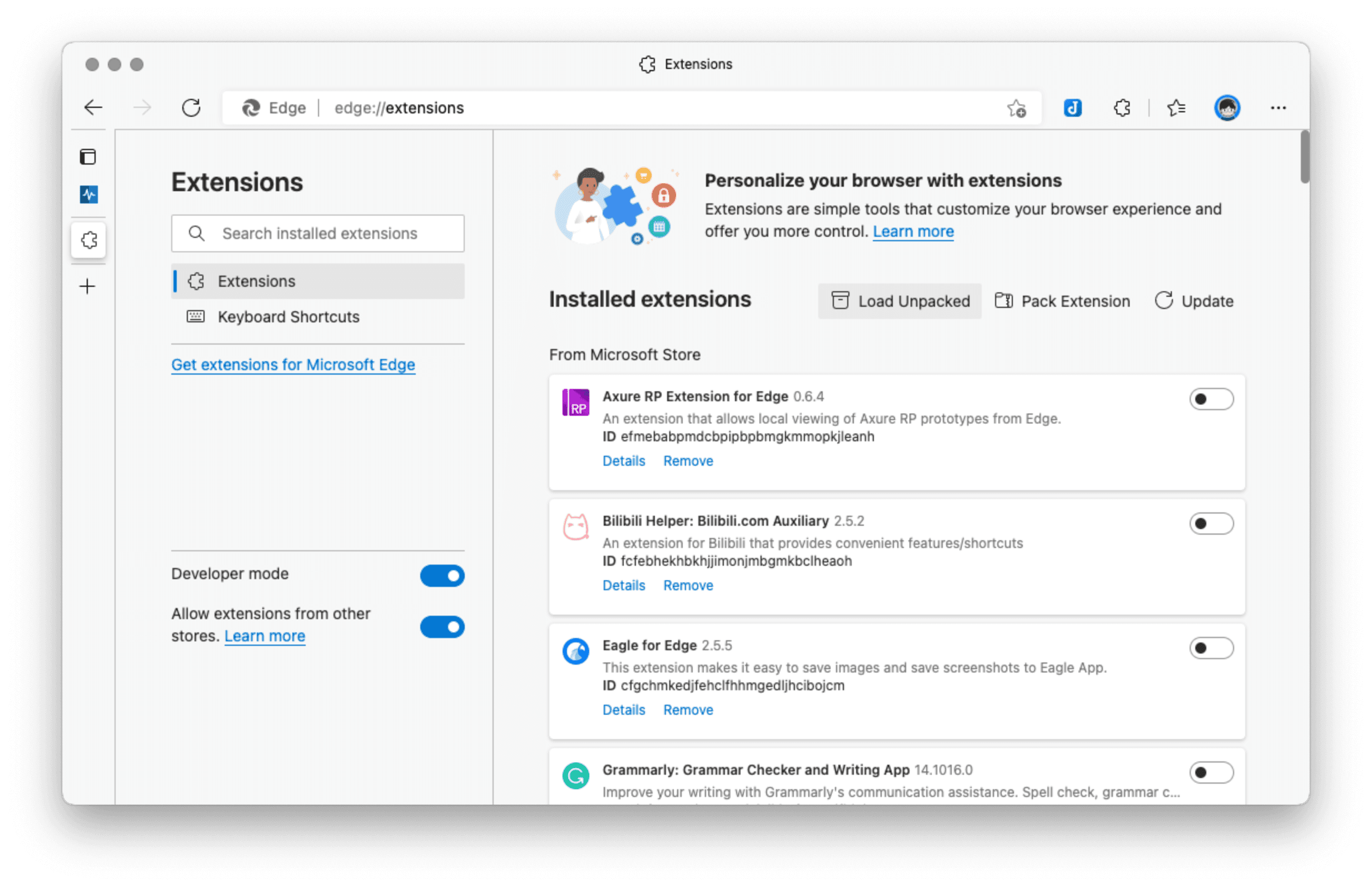 Open Edgeās extension page, enable āDeveloper modeā, click āLoad Unpackedā, and select directory A from the extracted files above.