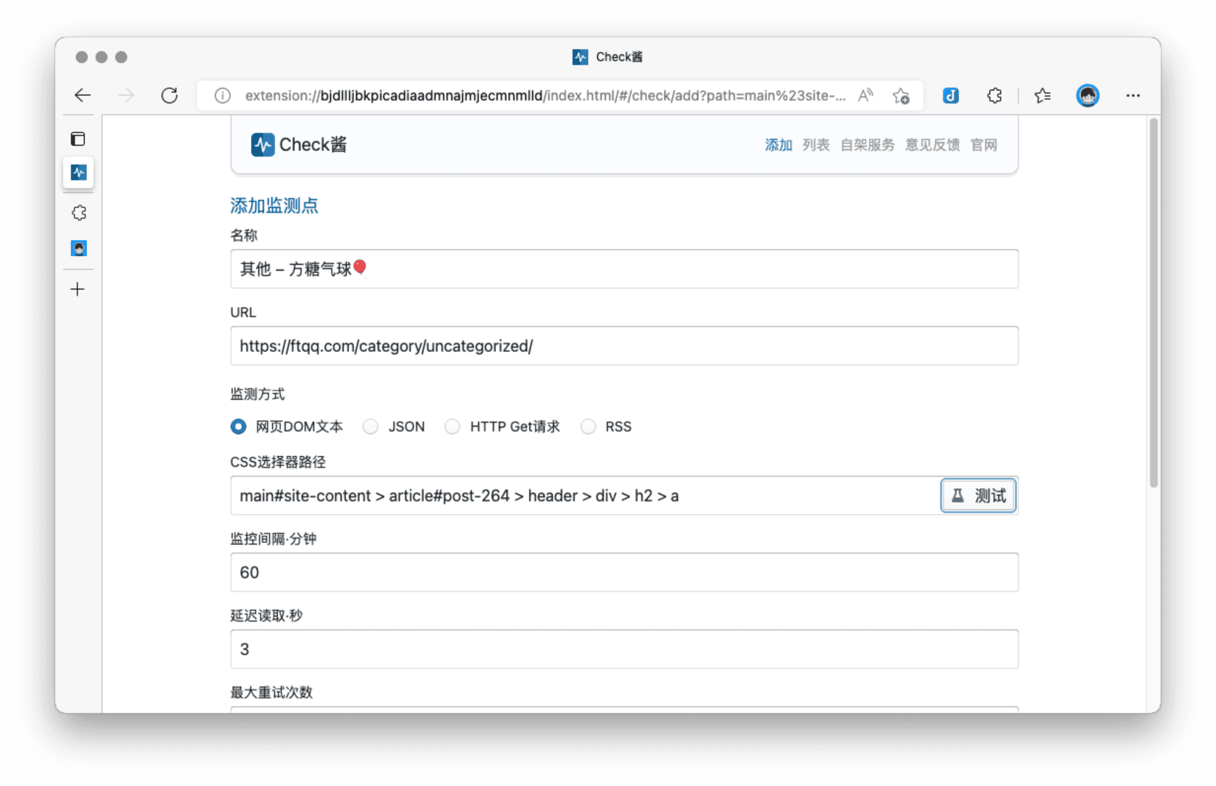 You can modify the name, set monitoring interval, delay, and maximum retry times. Before saving, itās best to click the āTestā button next to the āCSS Selector Pathā field to test.