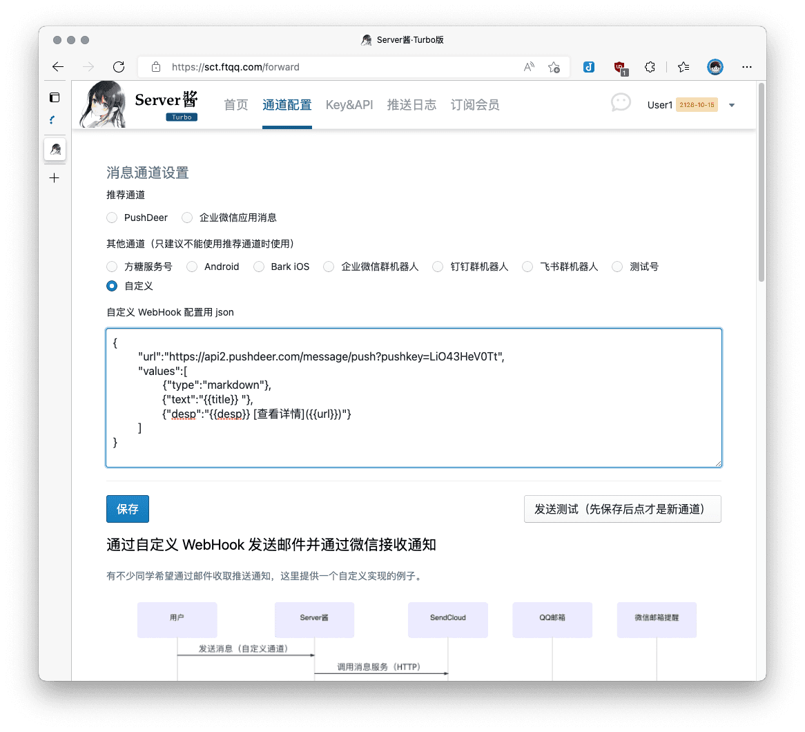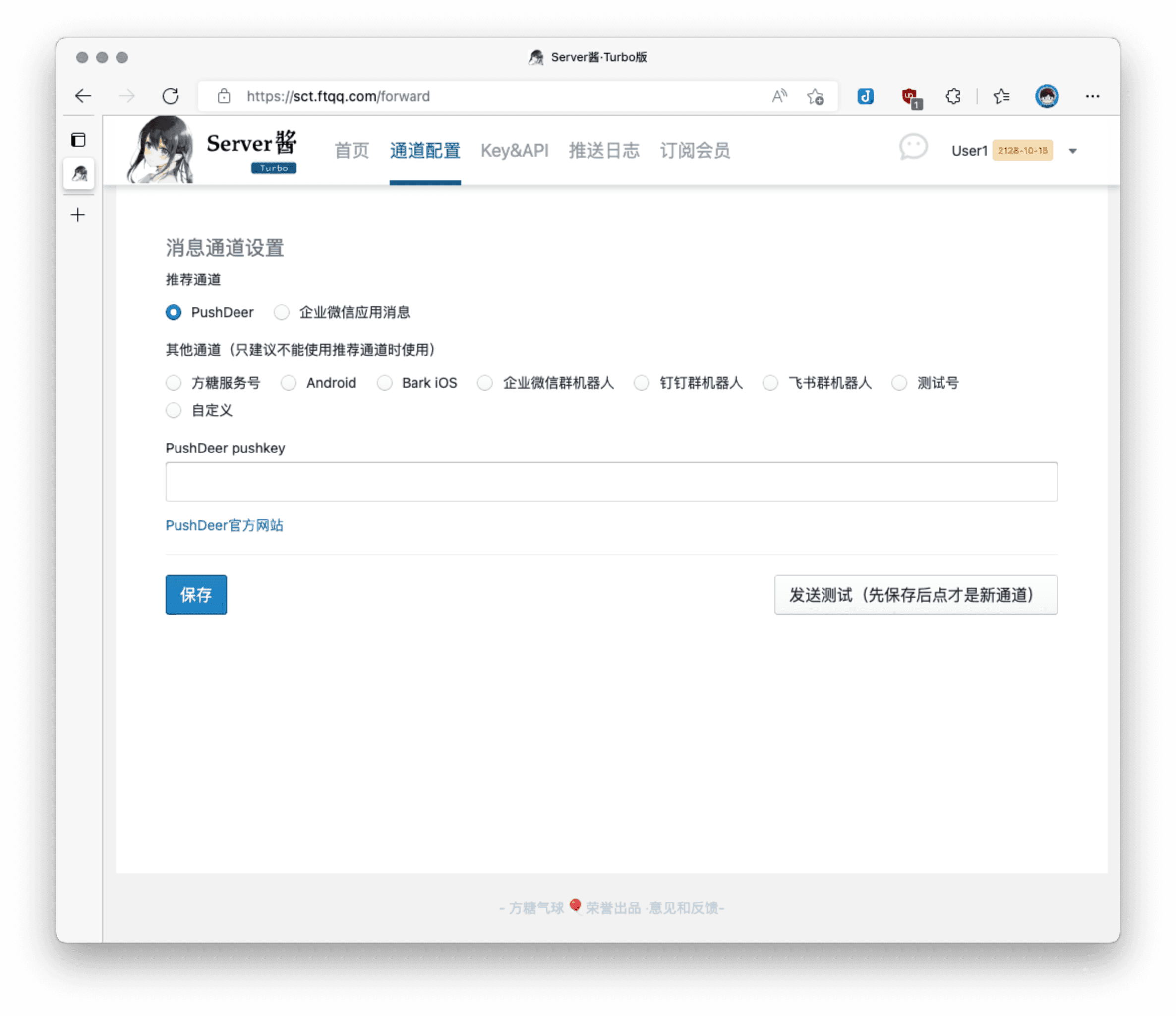 Log in to ServerChan Official Website, go to āChannel Configurationā, select the channel you want to push to, and follow the instructions on the page. Messages can be pushed to āPushDeerā and various group bots.