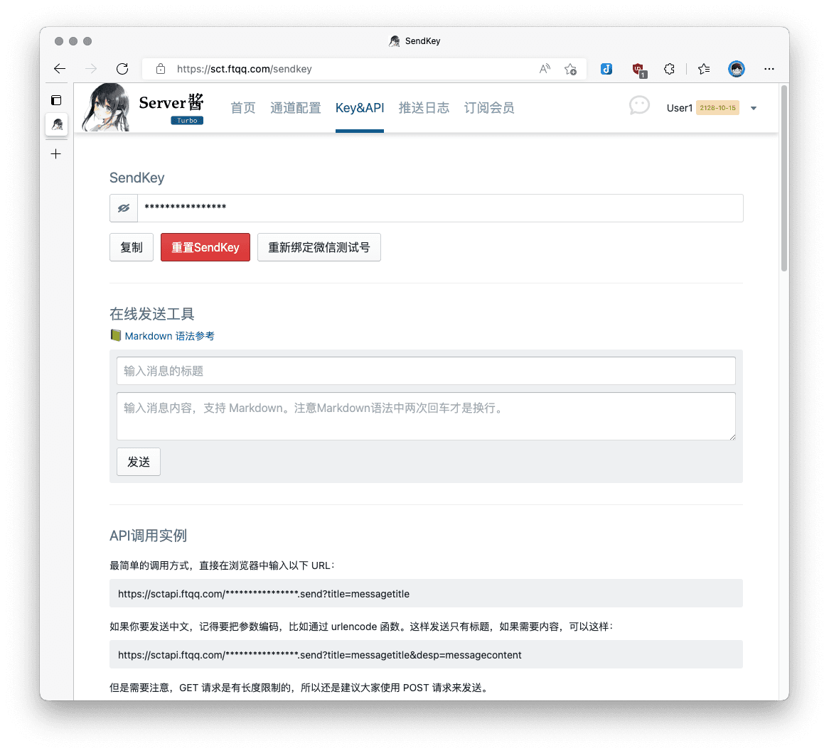 Log in to ServerChan Official Website, go to āKey&APIā, and click the āCopyā button.