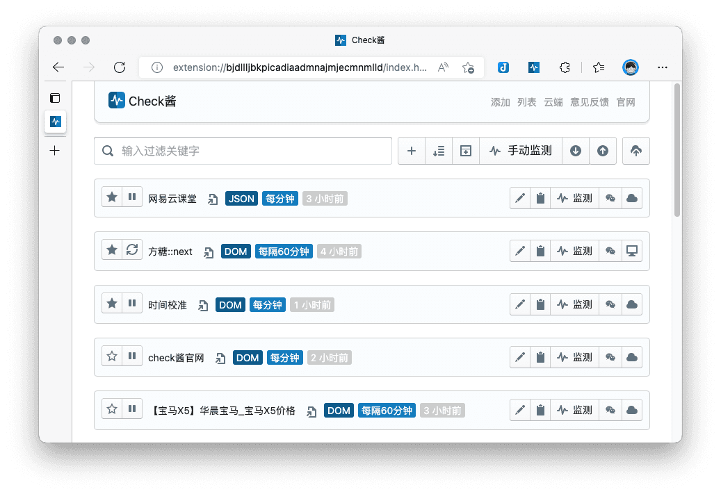 CheckChan works by opening webpages in the browser plugin background for monitoring, thus completely simulating real user behavior. It can monitor most complex dynamic webpages, backend pages requiring login, and (in most cases) automatically maintain login status.